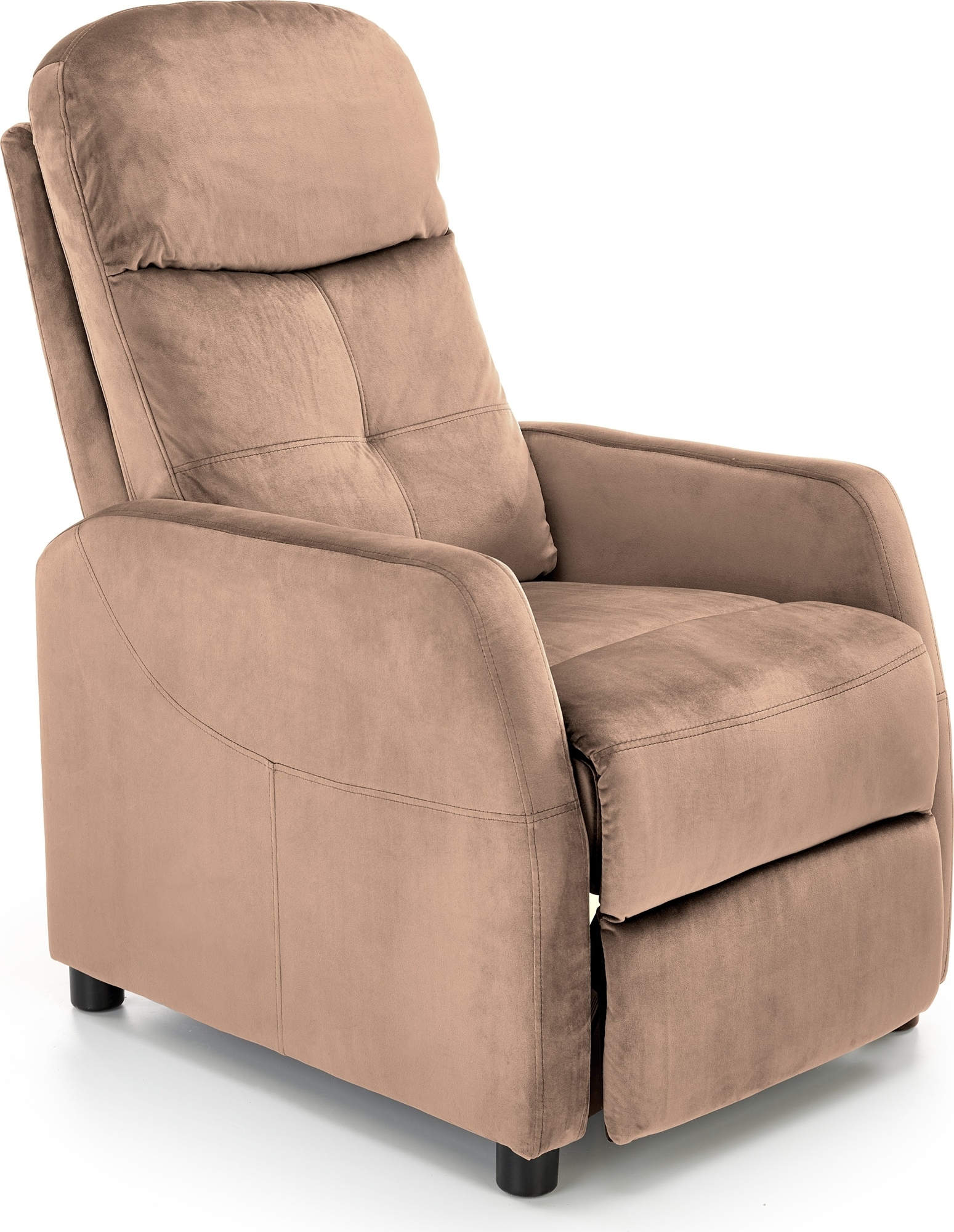 Polypropeenista valmistettu lepotuoli, jossa samettikangasverhoilu.
