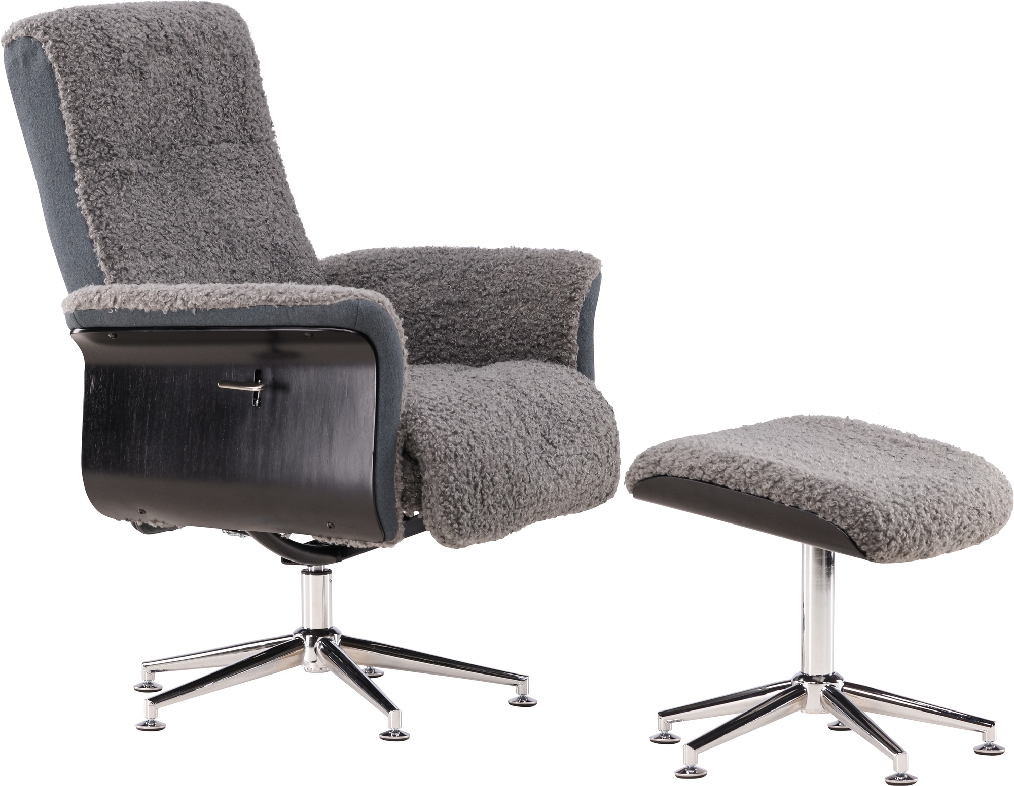 Tässä harmaa nalle, jonka sivuilla on puuta, mustaksi petsattu tammisuunnittelu ja kääntyvä kromattu metallijalusta luovat ainutlaatuisen ilmeen ja tuntuman. Lepotuolitoiminto voidaan asettaa ja lukita eri asentoihin. Mukana yhteensopiva rahi.