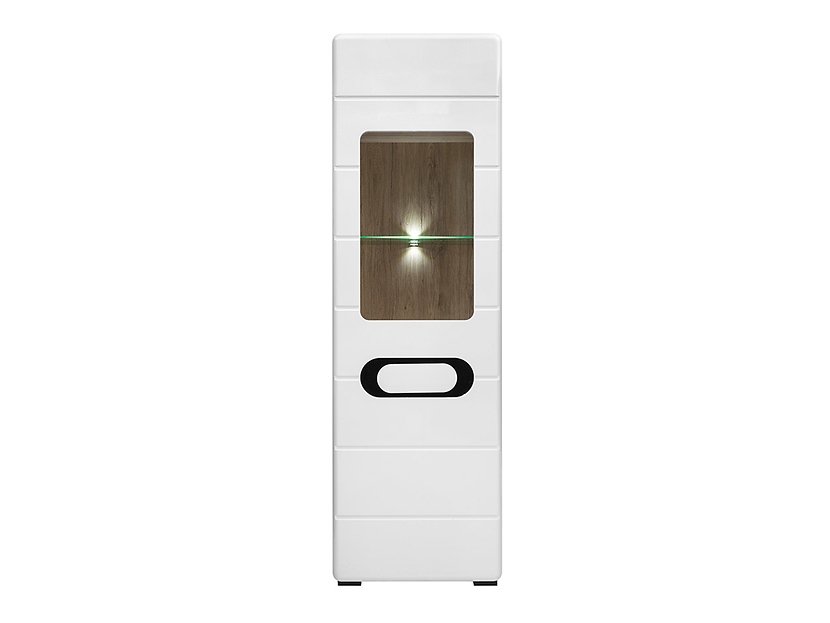 Tammikaappi, jossa valkoiset korkeakiiltoiset etupinnat. Elliptinen musta lasi toimii kahvana ja antaa myös modernin muotoilun tunteen. Oven lasiosan avulla voit esitellä hienoimpia laitteitasi, joita myös valaisee integroitu LED-valaistus.