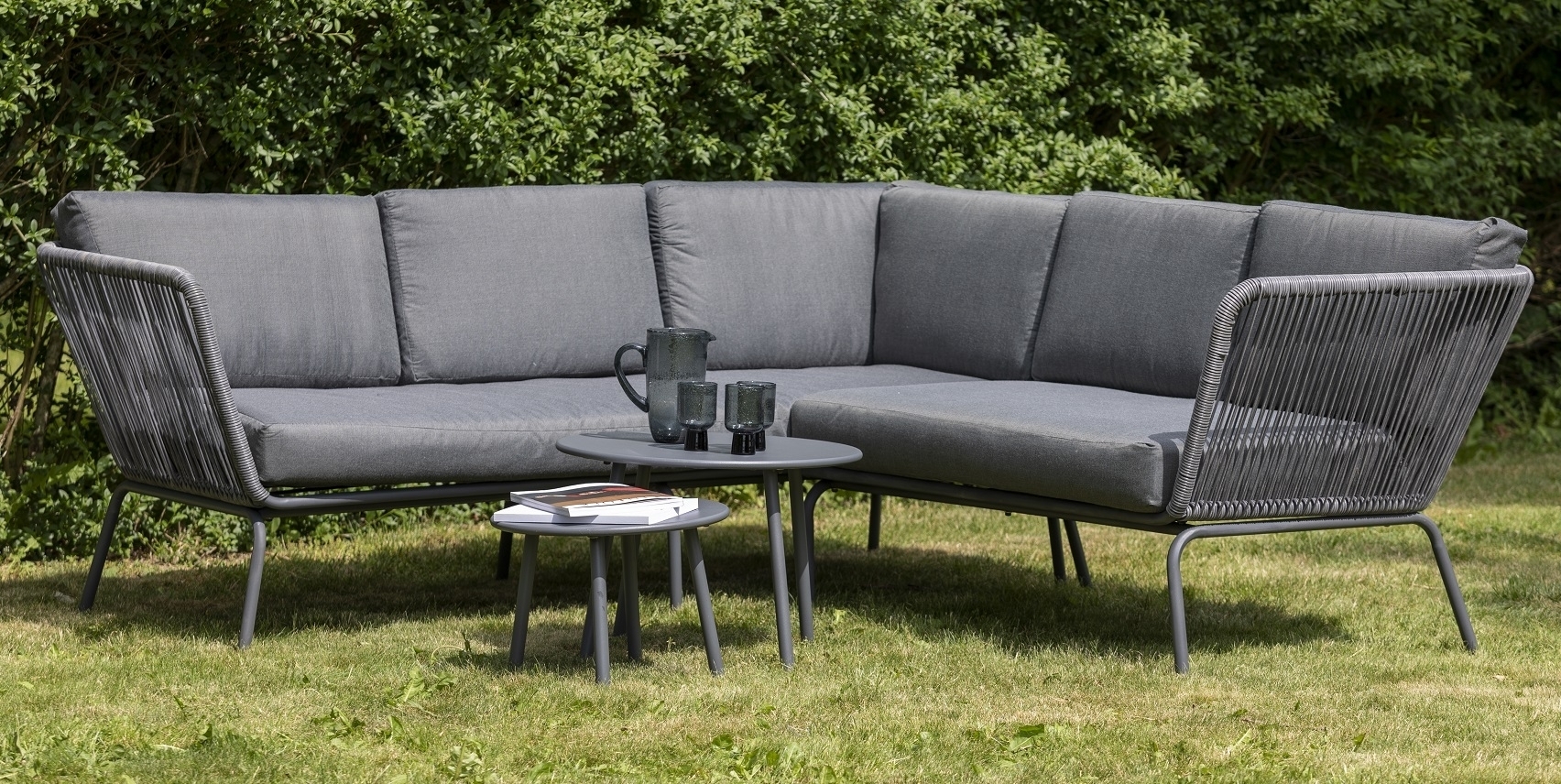Halmstad ulkoiluryhmä, sohva ja sivupöytä rungolla tummanharmaata alumiinia/synteettistä rottinkia ja harmaat istuin- ja selkätyynyt. Kaksi sivupöytää voidaan sijoittaa terassille haluamallasi tavalla.