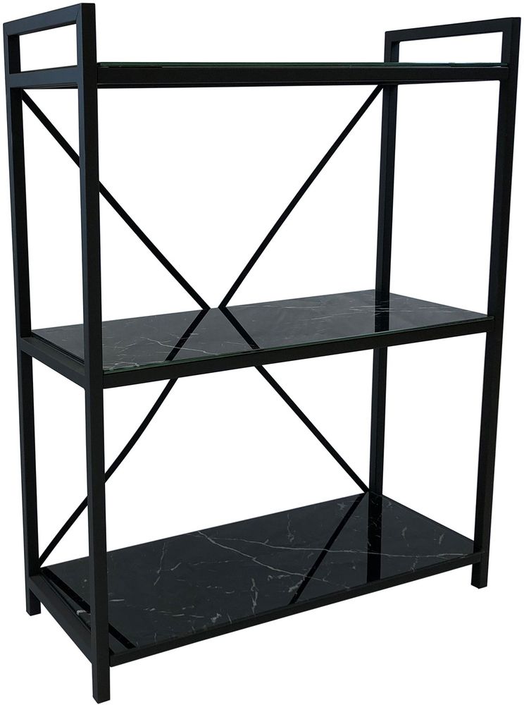 Tyylikäs kirjahylly marmorilaminoiduilla hyllyillä ja mustalla jauhelakatulla metallirungolla.