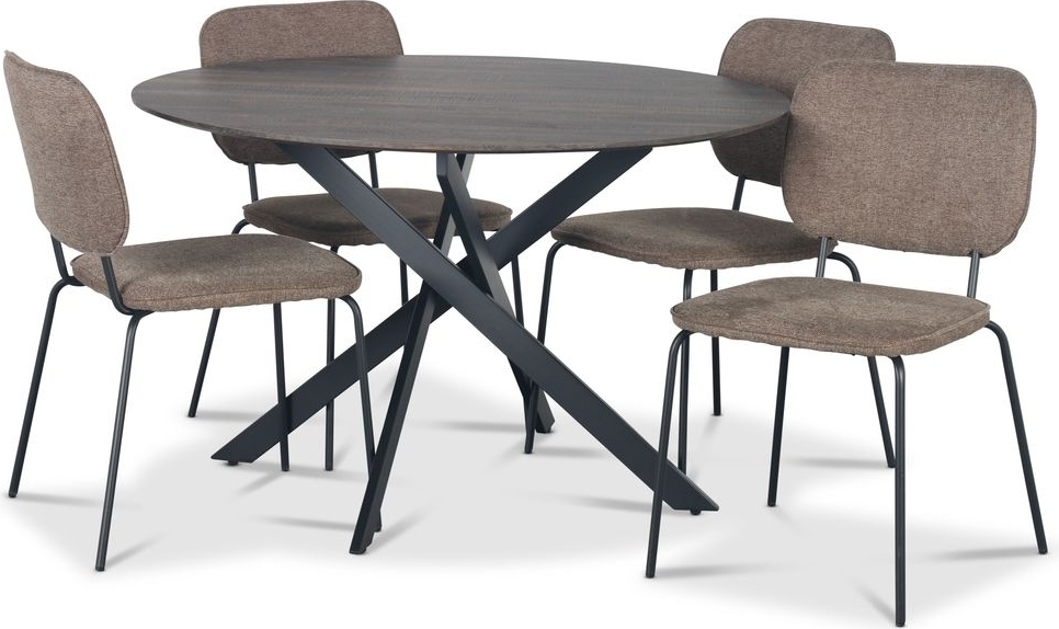 Hogrän ruokailuryhmä koostuu Ø120 cm pöydästä, jonka kansi on tummaa puuta MDF-levyä, pohja mustaa jauhemaalattua metallia. Mukana on myös 4 Lokrume-tuolia, joissa on ruskea verhoilu ja musta runko. Ruokailuryhmä tyylikkäällä modernilla designilla. Keskity olemaan minimalistinen suunnittelussa ja värien valinnassa, jotka sopivat hyvin yhteen.