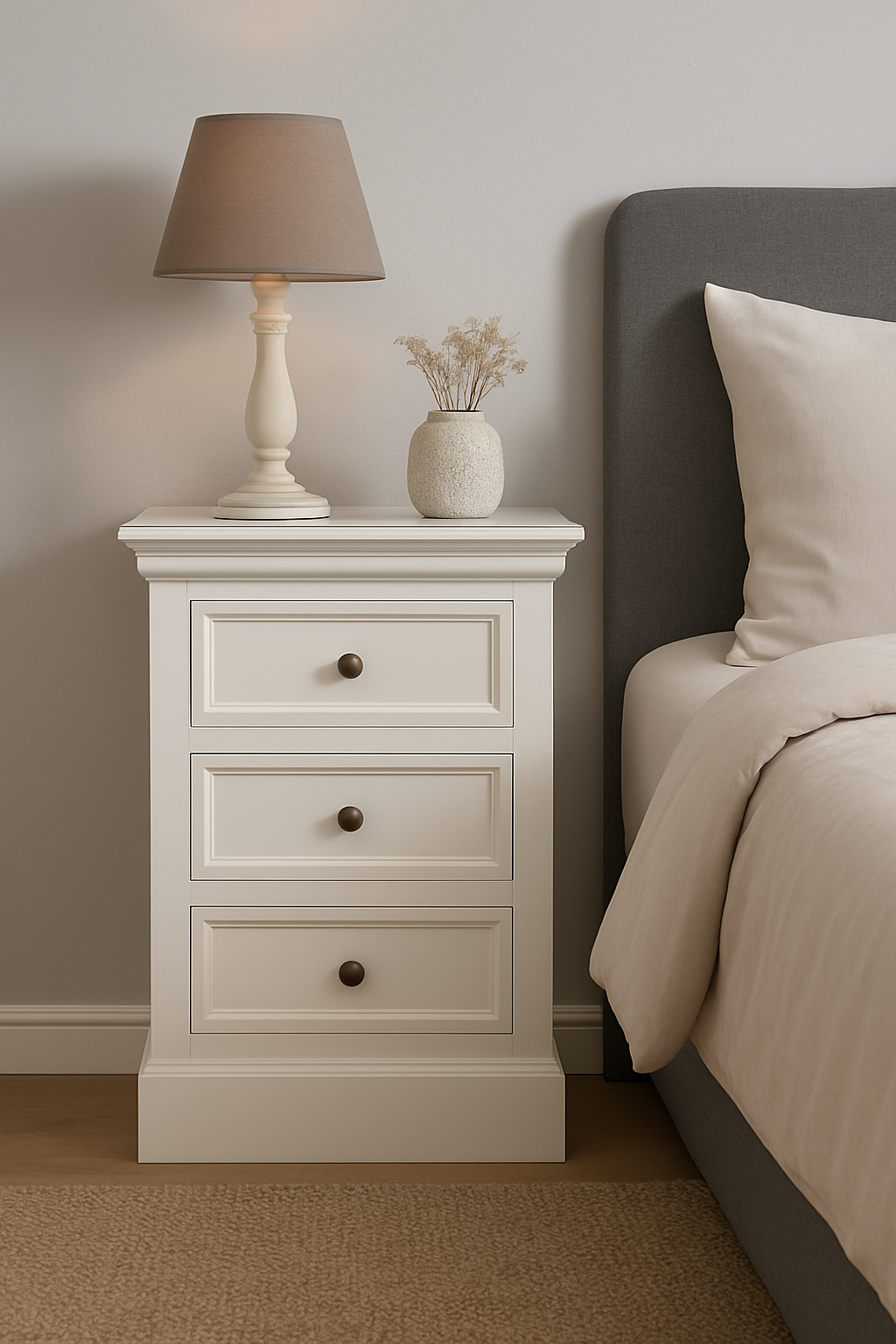 Bristol-yöpöytä, jossa on 3 laatikkoa, väri antiikkivalkoinen. Anna makuuhuoneellesi ajaton ja viehättävä ilme Holmby-yöpöydällä. Tässä tyylikkäässä yöpöydässä on kolme käytännöllistä laatikkoa, jotka tarjoavat runsaasti säilytystilaa tärkeimmille tavaroille, kirjoille tai pienille tavaroille.