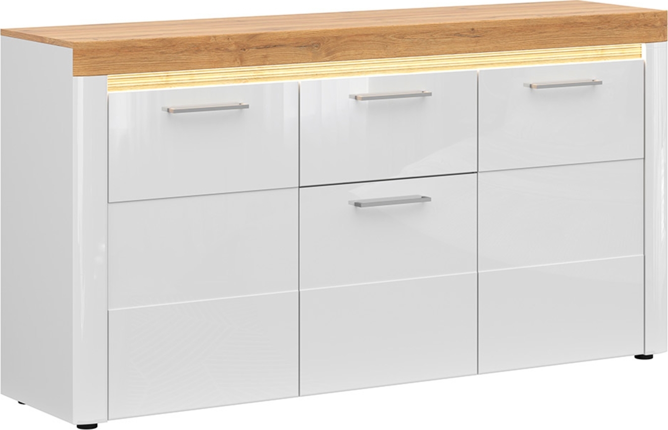 Puusta valmistettu senkki, jossa on sisäänrakennettu LED-valaistus.