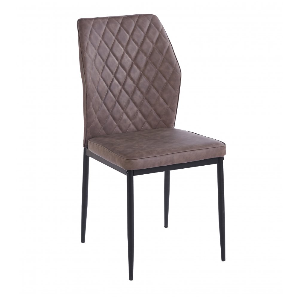 Inez-ruokatuoli, jossa on verhoiltu istuin ja selkänoja, joka on verhoiltu ruskealla vintage-tekonahalla. Jalat ovat mustaksi lakattua metallia. Ruokapöydän tuoli sopii sekä pyöreille että suorakaiteen muotoisille pöydille.