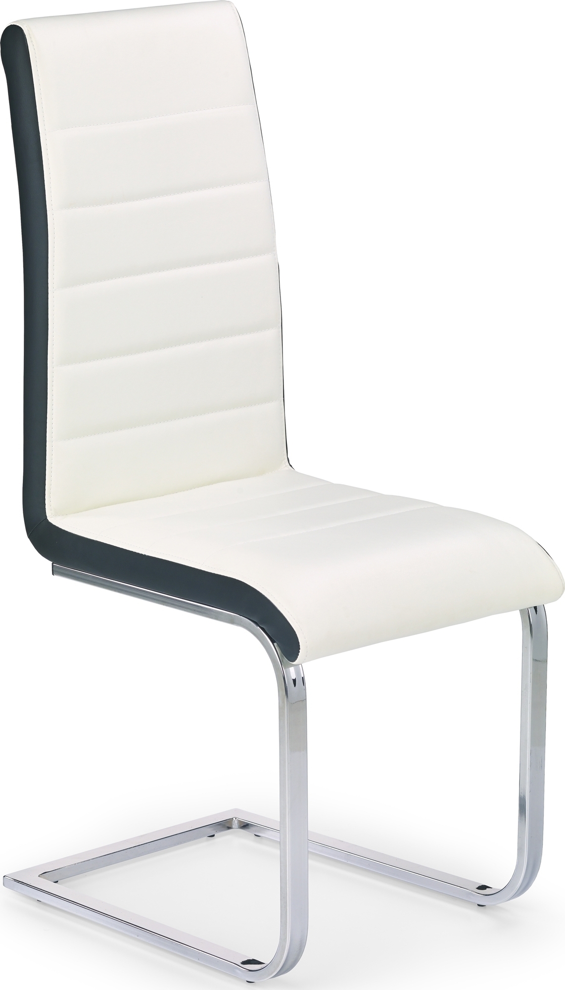 Mukava ruokatuoli modernilla designilla. Runko on valmistettu kromatusta metallista, istuin on verhoiltu todella miellyttävällä mustalla & valkoisella keinonahkalla lopullisen mukavuuden takaamiseksi.