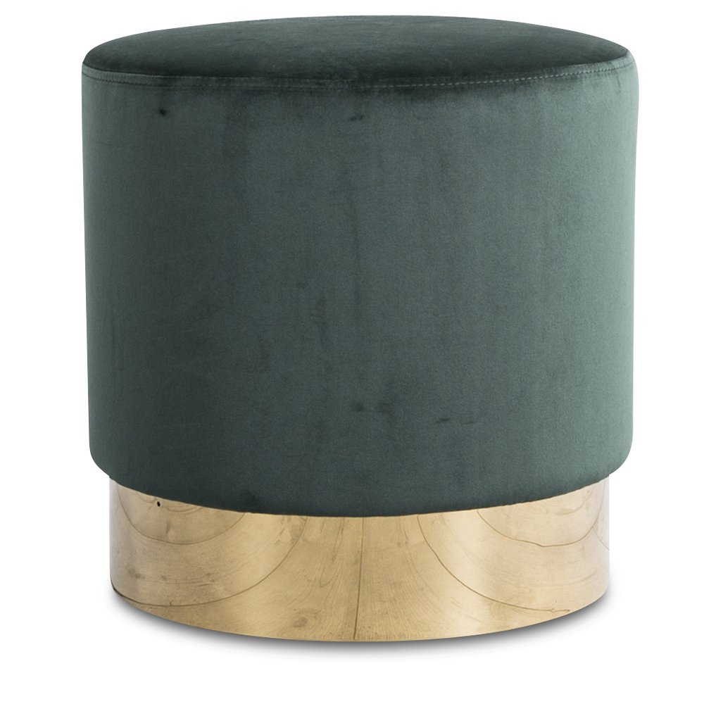 Sylinterinmuotoinen, vihreällä samettikankaalla verhoiltu lattiatyyny messinkirenkaalla.
