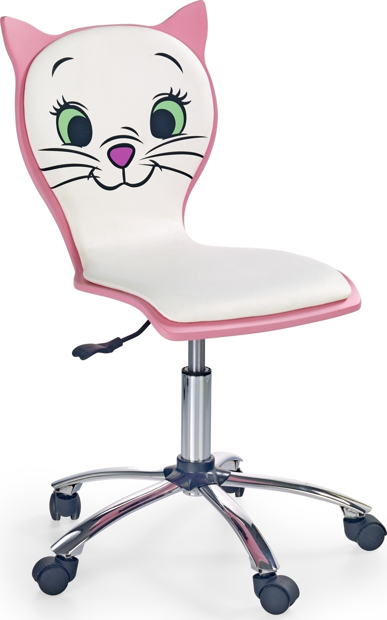 Viihtyisä kirjoituspöydän tuoli, joka sopii täydellisesti lastenhuoneeseen. Valmistettu metallista ja maalatusta vanerista, verhoilu on erittäin mukavantuntuista ja siinä on painettu kissan kuva, joka myötäilee selkänojan muotoilua. Säädettävä istuin ja tuolia on helppo liikutella kromisen tähtijalustan pyörien ansiosta.