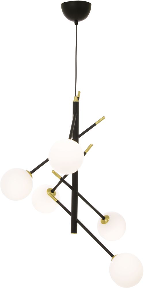 Kattovalaisin mustaa metallia, yksityiskohdat matta messinkiä. Opaalinvalkoiset lasikupit. Helppo kattoripustus.