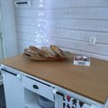 Yksi hyllytaso keskellä ja kaksi kaappia sivuilla ilman hyllytasoja, johonka voi sijoittaa tilaa vieviä keittiötavaroita, maljakkoja tai muita tavaroita joita ei halua pitää esillä.