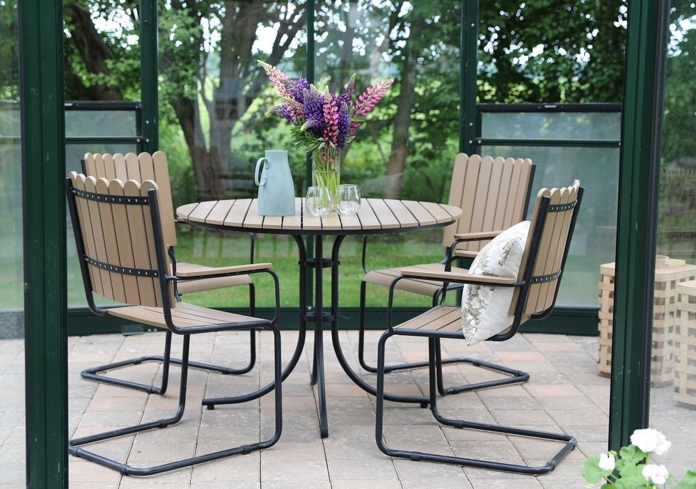 Holmsund on klassinen ulkoiluryhmä, joka on valmistettu ruskeakuvioisesta aintpuusta ja runko kestävää mustaa metallia. Tämä tekee ulkoryhmästä säänkestävän ja kestävän selviytymään ulkoilmasta. Ryhmässä on skandinaavinen muotoilu.