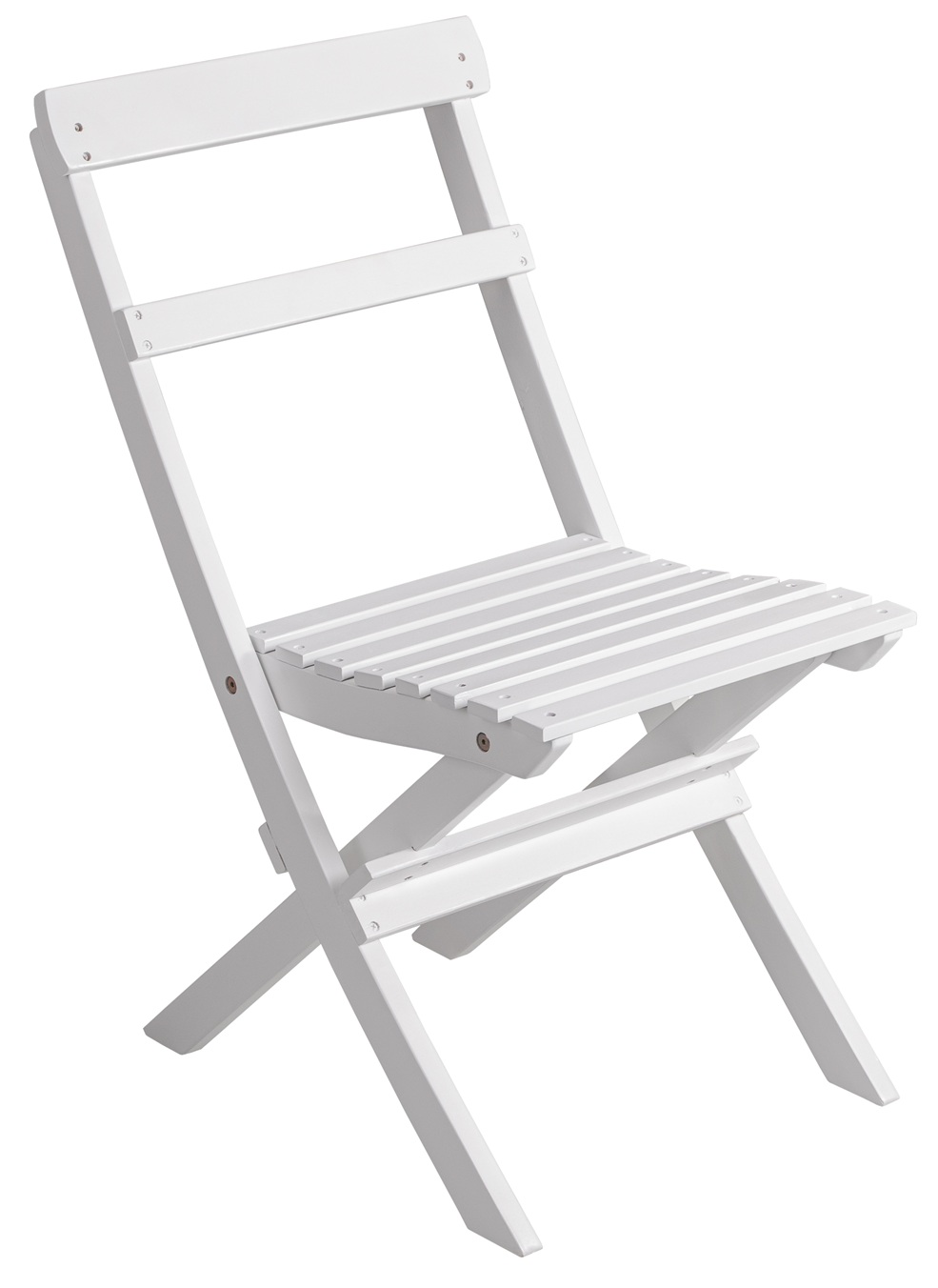 Klassinen valkoinen puutuoli. Tuoli on taitettava ja voidaan helposti laittaa sivuun, kun sitä ei käytetä.