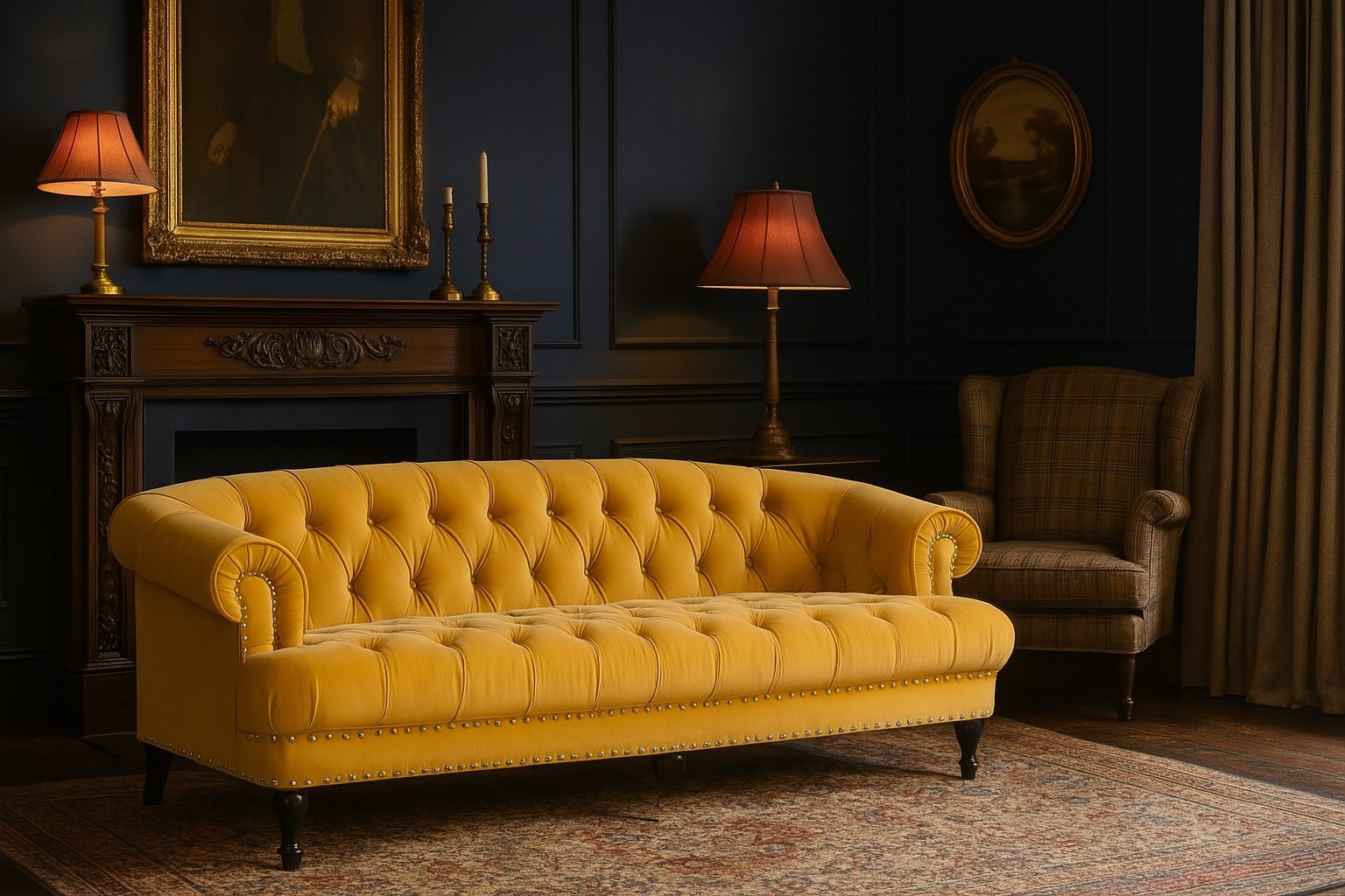 Kolmen istuttava Oxford deluxe chesterfield -sohva pehmeällä leijonankeltaisella sametinkaltaisella kankaalla. Oxford on moderni chesterfield-sohva, joka sopii sekä moderniin että klassiseen olohuoneeseen. Sorvatut ja mustalakatut puujalat. Niitit kromattua metallia.