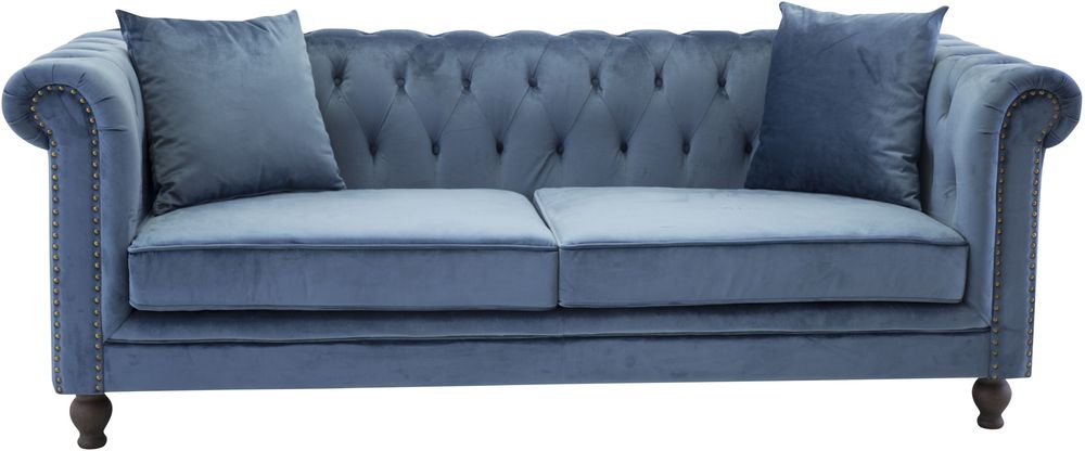 Tyylikäs sinisellä samettikankaalla verhoiltu sohva. Edessä koristeelliset niitit. Runko on massiivipuuta.