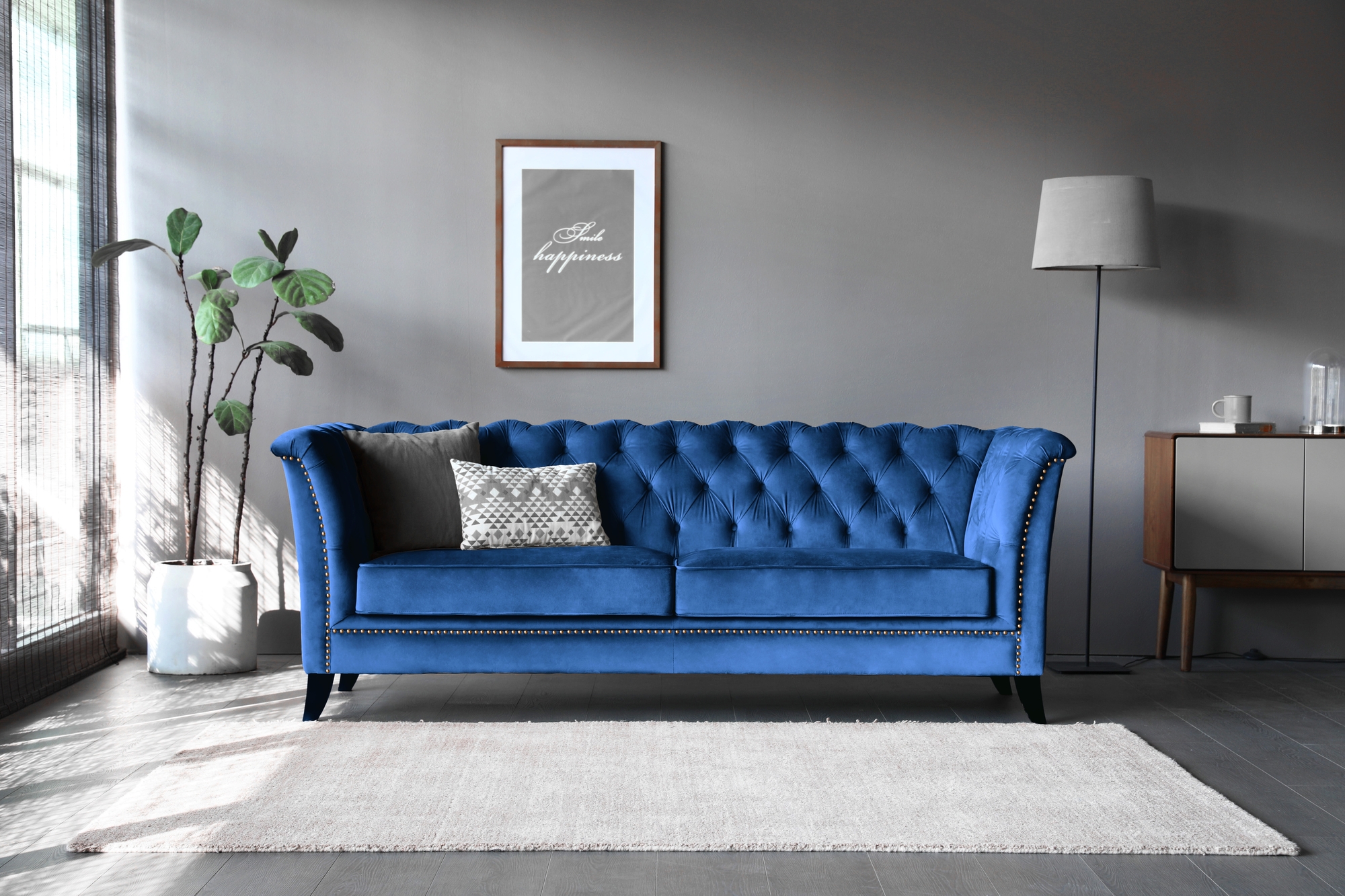 Kolmen istuttava sohva Milton Chesterfield - Tummansininen sametti + Huonekalujen puhdistus