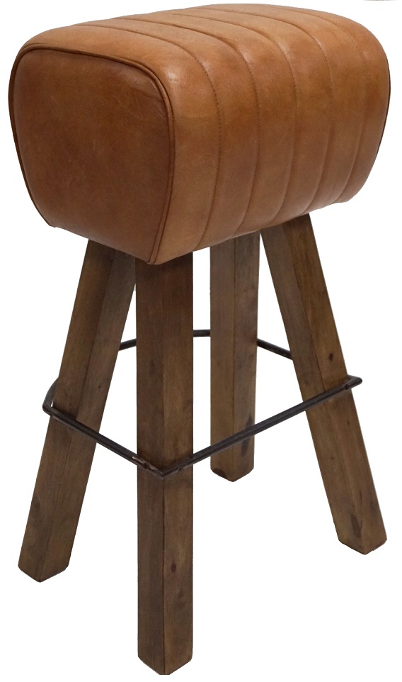 Korkea jakkara puisilla jaloilla, verhoiltu antiikkikäsitellyllä ruskealla nahkalla. Muistuttaa voimistelupenkkiä. Tuo rustiikkimaista vivahdetta sisustukseen.