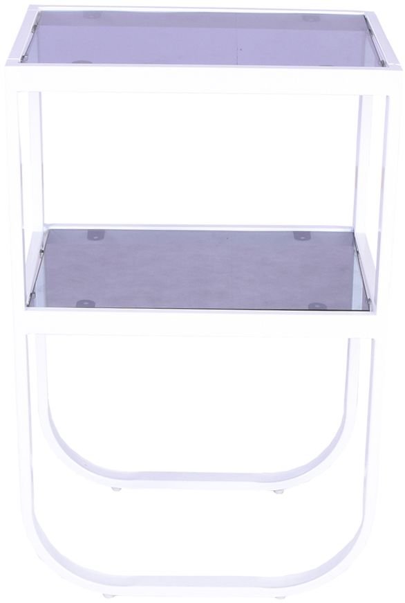 Korsbacken on huonekalusarja, jossa on metallirunko ja värillisestä lasista tehdyt tasot/hyllyt. Tässä versiossa on valkoinen runko ja harmaat lasipaneelit.