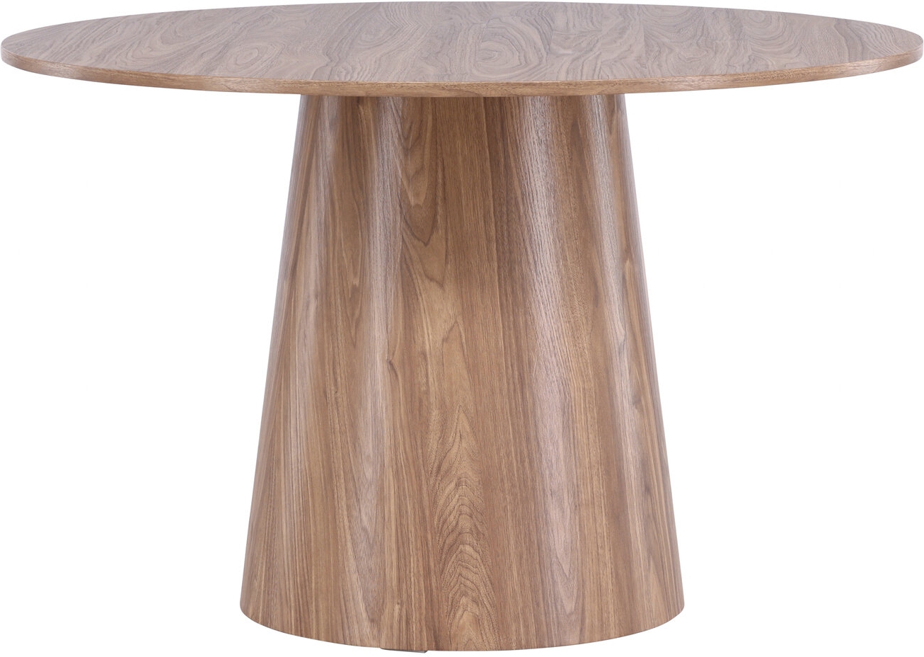 Ruokapöytä, joka vakuuttaa skandinaavisella muotoilullaan ja tyylikkäällä muotoilullaan. Pöytä on valmistettu MDF-levystä ja siinä on ohut, pyöreä kansilevy sekä kartiomainen runko, joka on keskitetty pöydän alle. Maanläheinen, saksanpähkinän kaltainen väri korostaa materiaalin luonnollisia kuvioita ja luo eloisan ilmeen, jossa on syvyyttä ja liikettä. Tyylikäs katseenvangitsija kodin sydämeen - täällä kukaan ei ole yksin.
