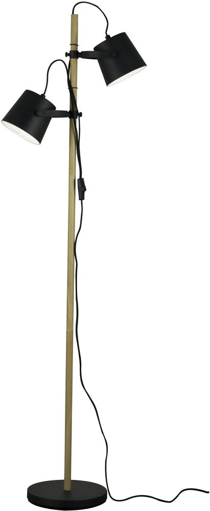 Lattiavalaisin mustaa metallia puisilla yksityiskohdilla. Kaksi lampun päätä. Kytke johto päälle.