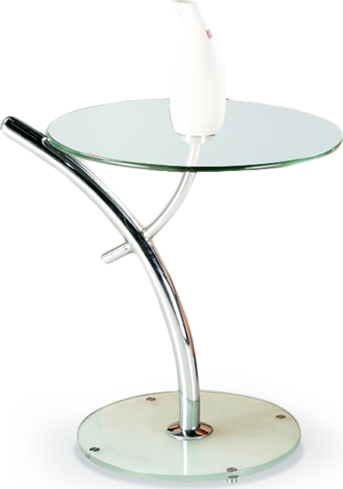 Kaunis sivupöytä modernilla muotoilulla. Runko on valmistettu kromatusta metallista ja jalat sekä pöytälevy ovat lasia .