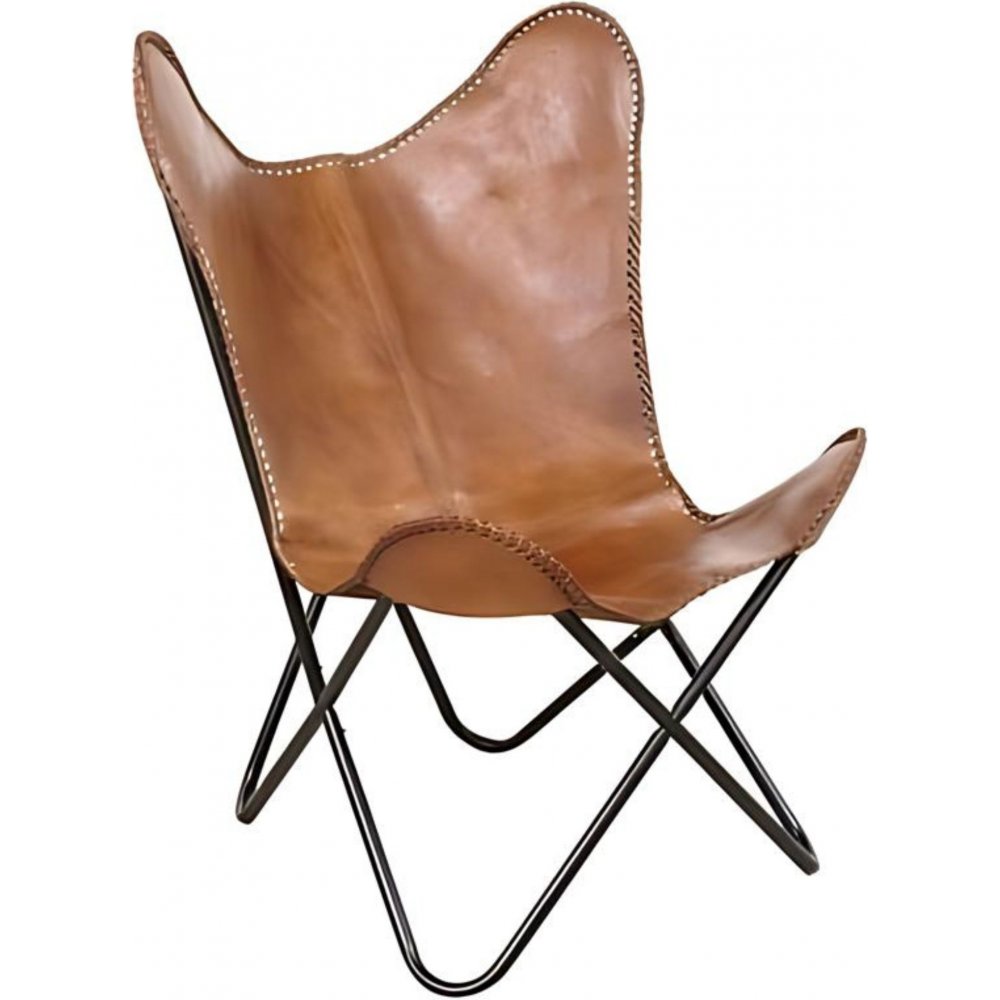 Klassinen tuoli lepakkotyylisellä muotoilulla. Aitoa konjakinväristä nahkaa, mikä sopii hyvin yhteen tuolin mustan metallirungon kanssa.