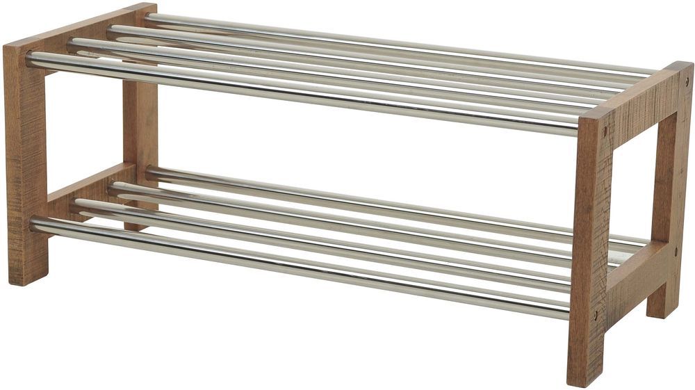 Tammesta valmistettu vahvarakenteinen kenkähylly, jossa on metalliset tangot ja antiikkinen ulkoasu. Yhdistelmä tuo kotiin vintage-tunnelmaa ja sopii hyvin yhteen kodin muiden huonekalujen kanssa.