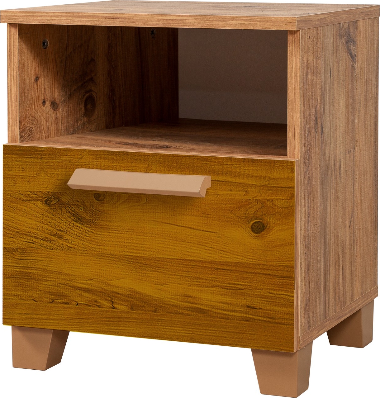Puusta valmistettu yöpöytä, jonka jalat muovia ja reunat PVC:tä.