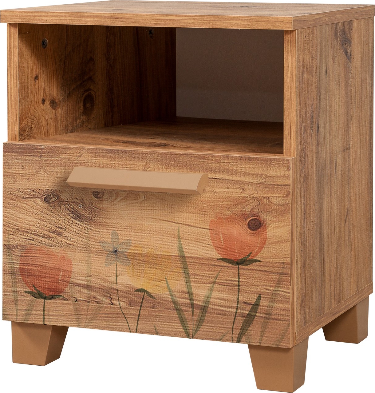 Puusta valmistettu yöpöytä, jonka jalat muovia ja reunat PVC:tä.