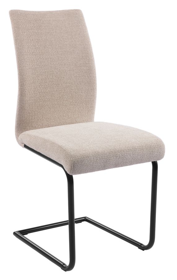 Lina ruokapöydän tuoli päällystetty beigellä boucle-kankaalla ja mustat metallijalat.