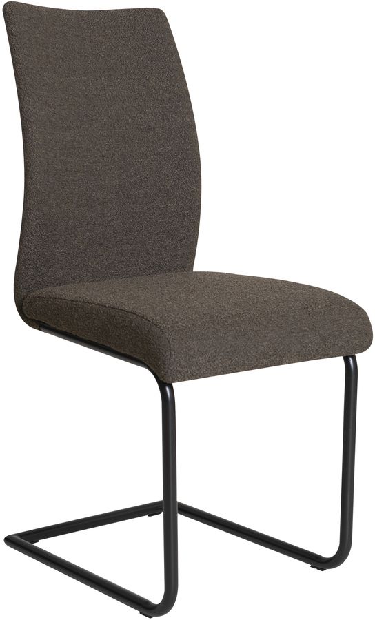 Lina-ruokailutuoli päällystetty tummanruskealla boucle-kankaalla ja mustat metallijalat.