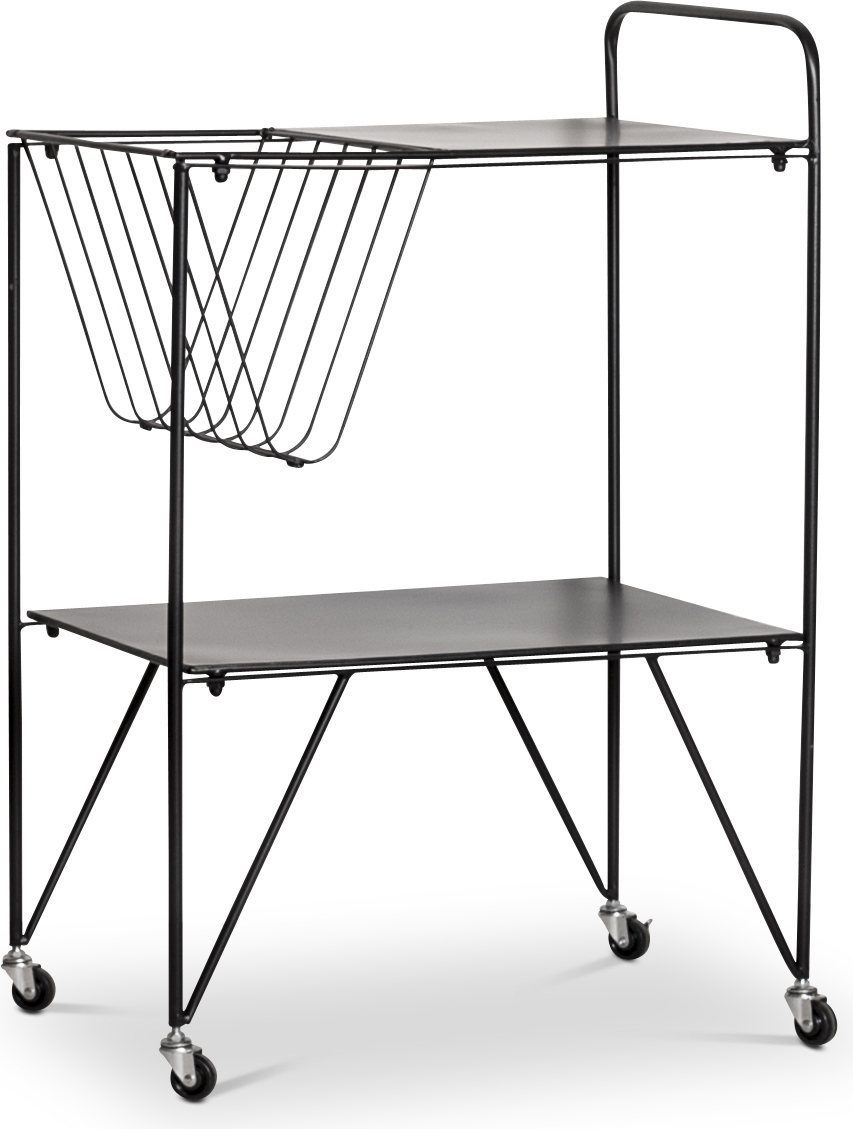 Klassinen tarjoiluvaunu tyylipuhtaalla designilla. Vaunu on valmistettu mustalakatusta teräksestä ja varustettu lehtitelineellä.