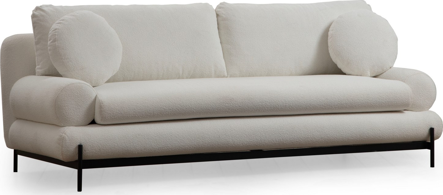 Pyökkipuusta ja lastulevystä valmistettu 3-istuttava sohva. Polyesteripäällinen ja metalliset jalat.
