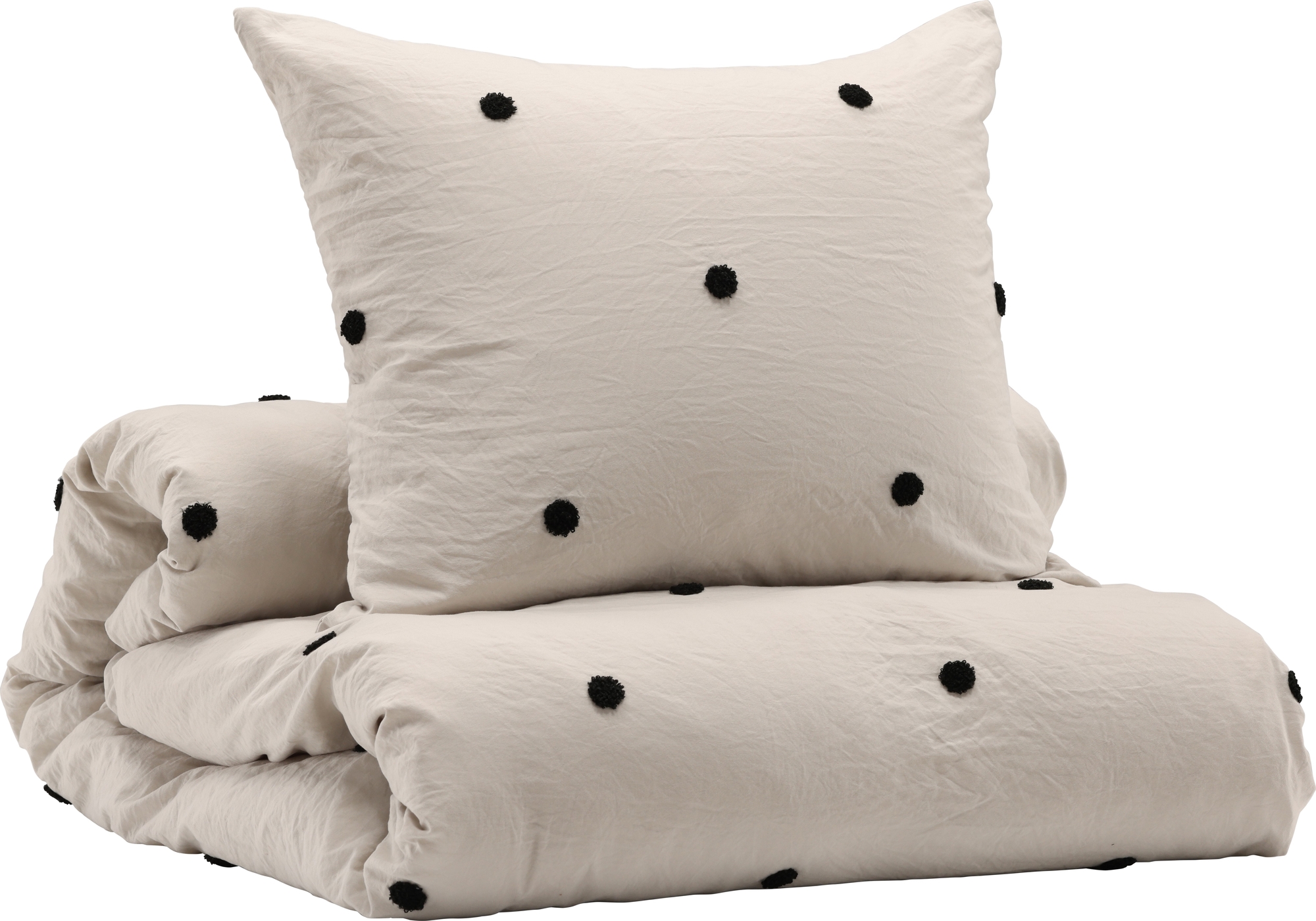 Sänky, jossa on yhtä pehmoinen makuulle kuin jossa on mukava nukkua. Liinavaatteet on valmistettu kestävästä ja mukavasta materiaalista mikrokuidusta, joka on pestävä ja kestää aikaa. Sänkysetti on vaaleanharmaa ja siinä on mustia tuftattuja pisteitä, jotka luovat eloisan katseenvangitsijan trendikkäissä väreissä.