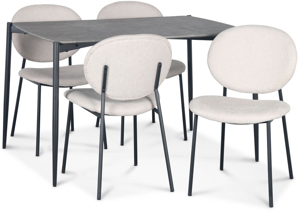 Lokrume ruokailuryhmä 120 cm pöytä jäljitelmäbetonia + 4 tuftattua beigeä tuolia