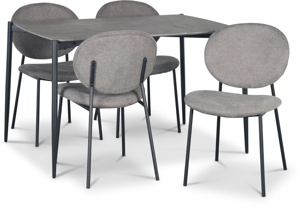 Lokrume ruokailuryhmä 120 cm pöytä jäljitelmäbetonia + 4 tuftattua harmaata tuolia