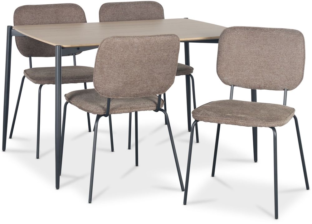 Lokrume ruokailuryhmä koostuu 120 cm pöydästä, jonka kansi on MDF-levyä vaalealla puulla, pohja mustaa jauhemaalattua metallia. Mukana on myös 4 Lokrume-tuolia, joissa on ruskea verhoilu ja musta runko. Ruokailuryhmä tyylikkäällä modernilla designilla. Keskity olemaan minimalistinen suunnittelussa ja värien valinnassa, jotka sopivat hyvin yhteen.