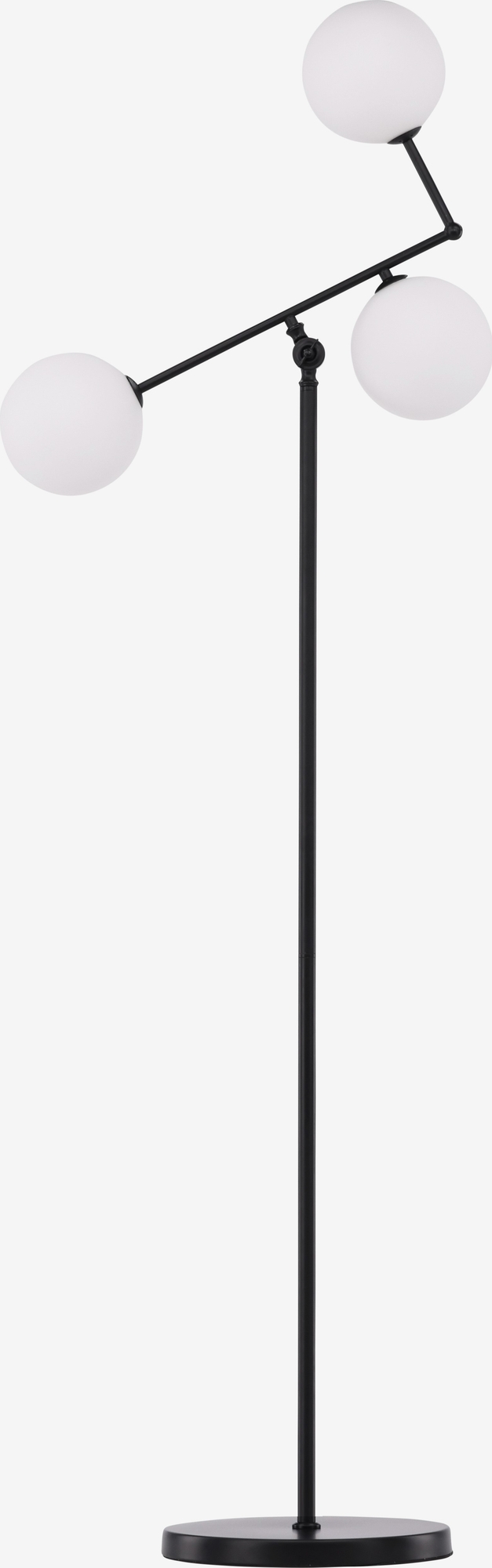 Pohjoismaista designia oleva lattiavalaisin yksinkertaisella mustalla mustalla rautaisella pohjalla ja pyöreillä valaisimilla. Valaisimessa on kolme pienempää valkoista lasia olevaa valonlähdettä, jotka on sijoitettu siisteille käsivarsille. Sijoita valaisin olohuoneen nurkkaan saadaksesi lisäyksityiskohtia ja kodikasta hehkua. Valaisin sopii useimpiin koteihin ja sisustustyyleihin ja kestää ajan kokeen.