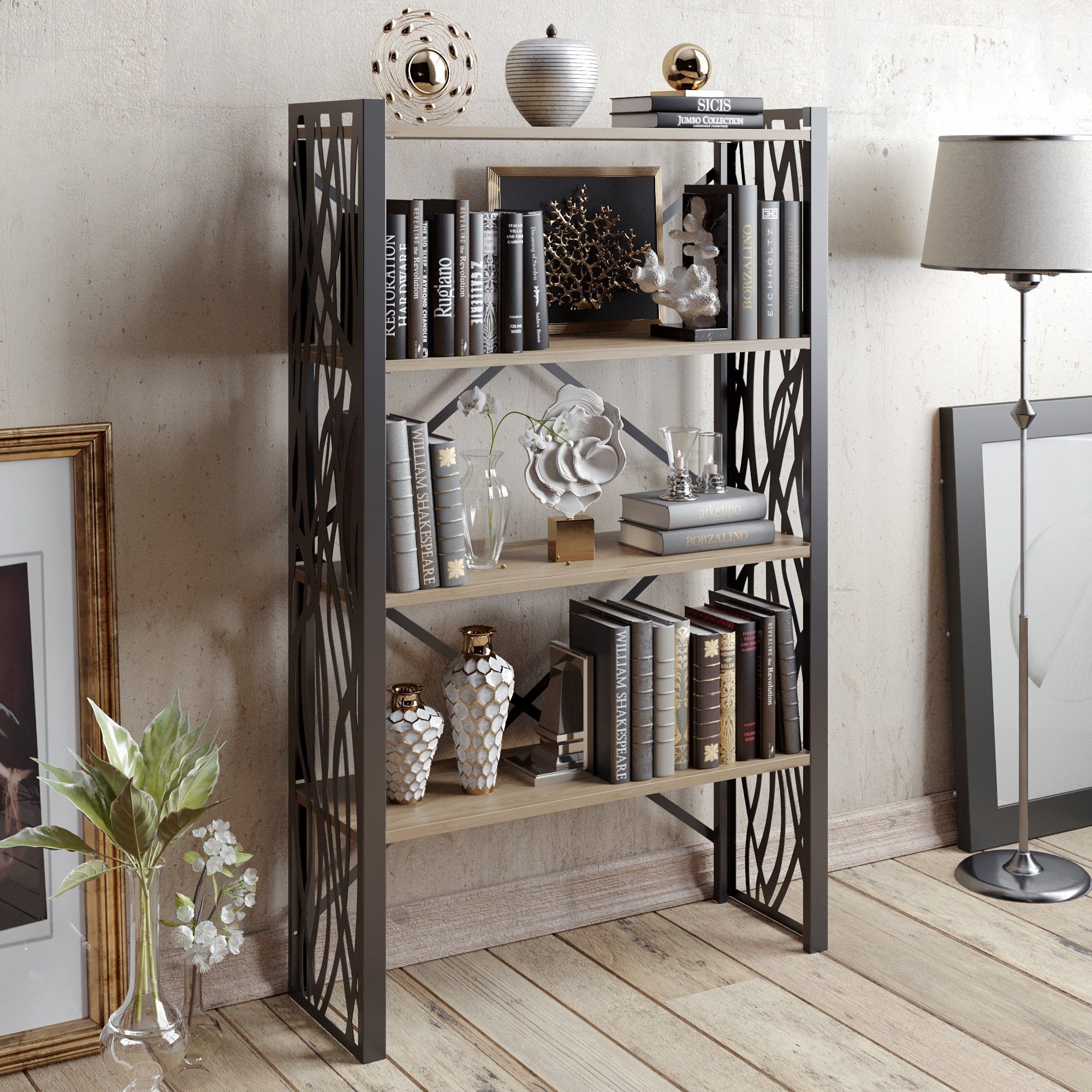 Puusta ja metallista valmistettu kirjahylly.
