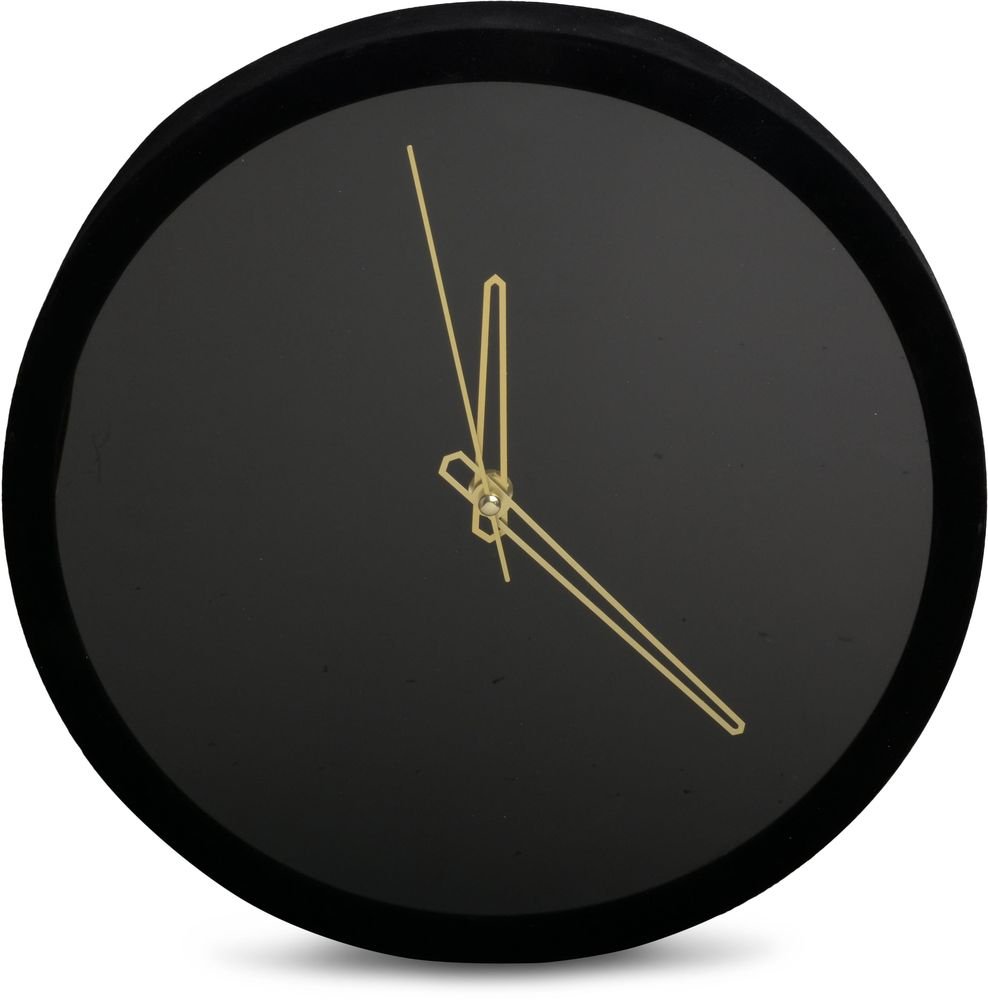 Upea ja moderni musta seinäkello kullanvärisillä viisareilla, valmistettu muovista.