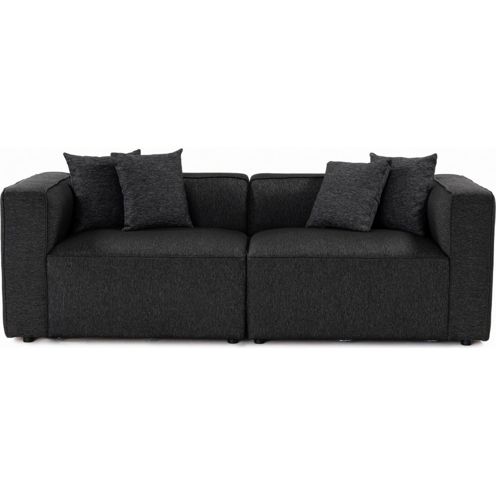 Pyökki-, kuusi- ja lastulevystä valmistettu sohva kangasverhoilulla ja muovijalat.