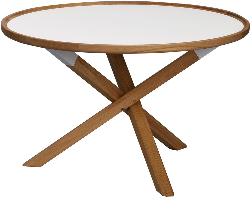 Morrisy-sohvapöytä valkoisella levyllä ja tammisella rungolla.