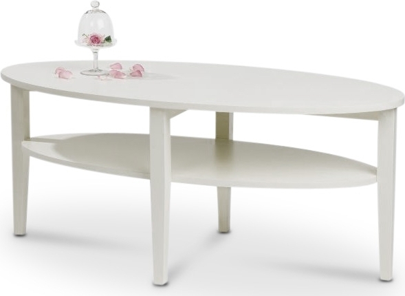 Soikea Nevada-sohvapöytä, valmistettu valkolakatusta MDF:stä, varustettu hyllyllä.