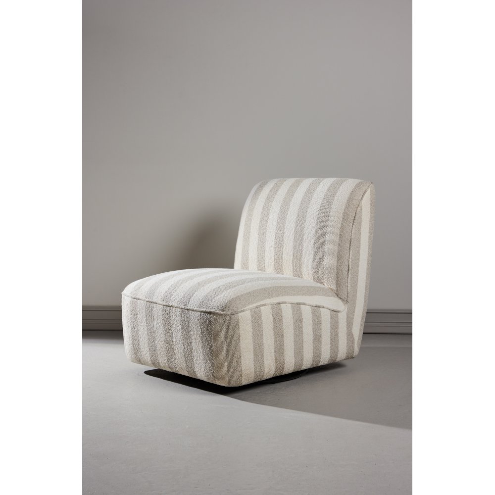 My on kutsuva käsinojaton nojatuoli, joka on suunniteltu tarjoamaan sekä mukavuutta että persoonallisuutta. Runsaasti pehmustettu istuin ja selkänoja tarjoavat mukavan istumiskokemuksen - täydellinen rentoutumiseen, lukemiseen tai pitkiin keskusteluihin. Tuoli erottuu edukseen leveillä, valkoisilla ja beigenvärisillä raidoillaan, jotka antavat sille leikkisän mutta elegantin ilmeen. Minimalistisen muotonsa ansiosta My sopii yhtä hyvin olohuoneeseen kuin makuuhuoneeseen tai eteiseen - monikäyttöinen ja tyylikäs nojatuoli moderniin kotiin.