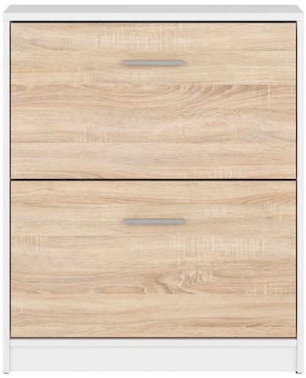 Nätti kenkäkaappi, valkoinen/tammi-imitaatio, kahdella kenkien säilytykseen tarkoitetulla lokerolla.