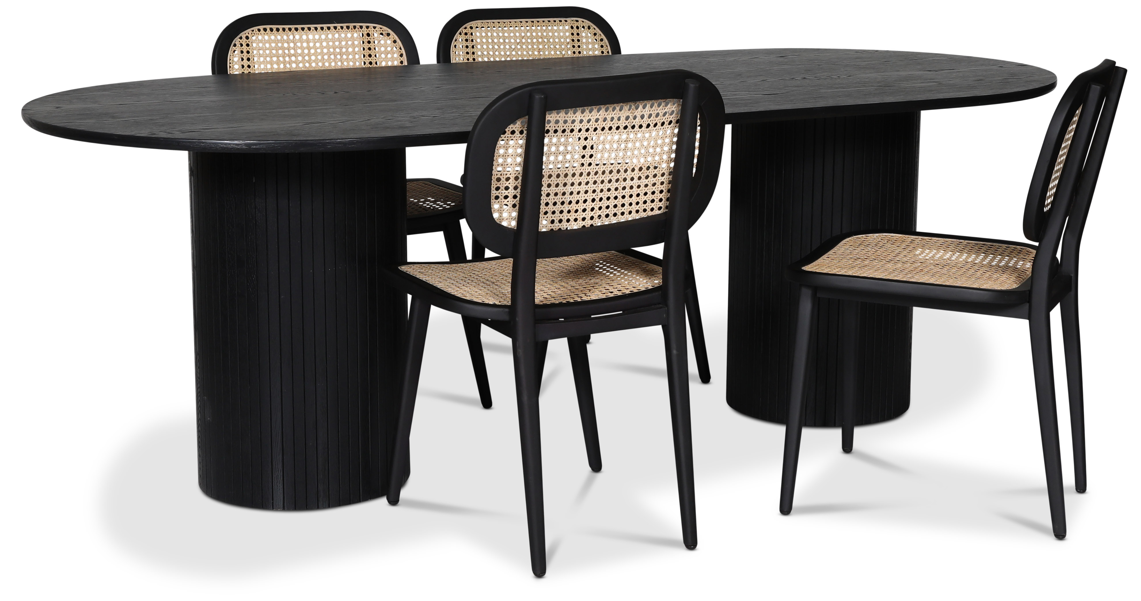 Nova elintarvikeryhmä; soikea ruokapöytä, mustaksi petsattu tammi + 4 Siknäs II tuolia musta/rottinki