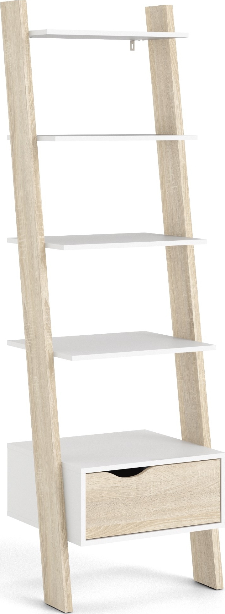 Lastulevyinen kirjahylly massiivipuisilla jaloilla.