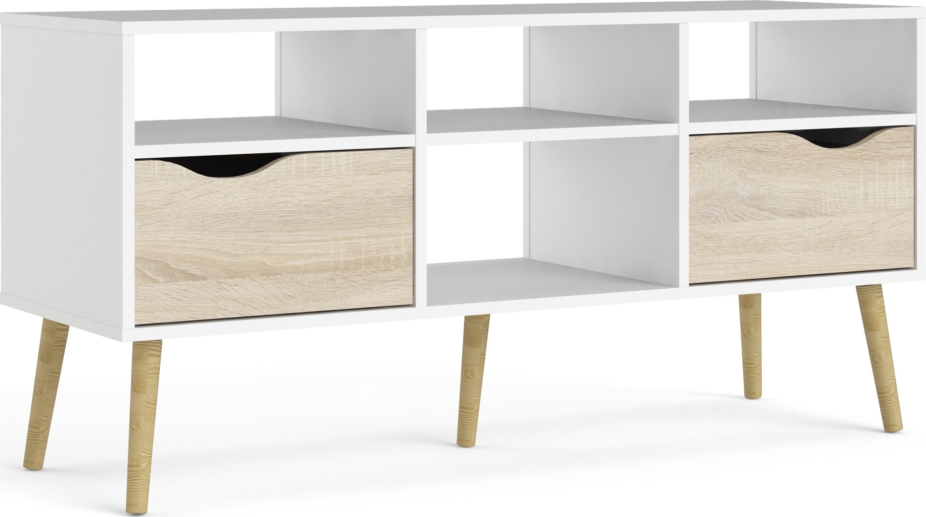 Oslon mediapenkki, jossa 2 laatikkoa ja 4 avointa lokeroa - Valkoinen/tammi