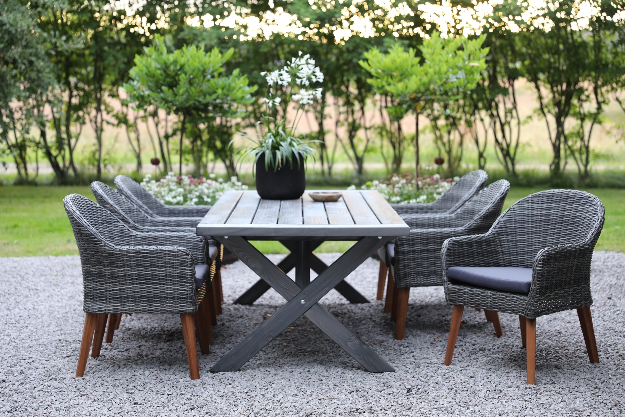 Ruokailuryhmä, jossa ruokapöytä harmaaksi petsattua mäntyä. Pöydässä on ristikkäiset jalat ja lankkupöytä, jotka antavat sille vankan ja ominaisen ulkonäön.