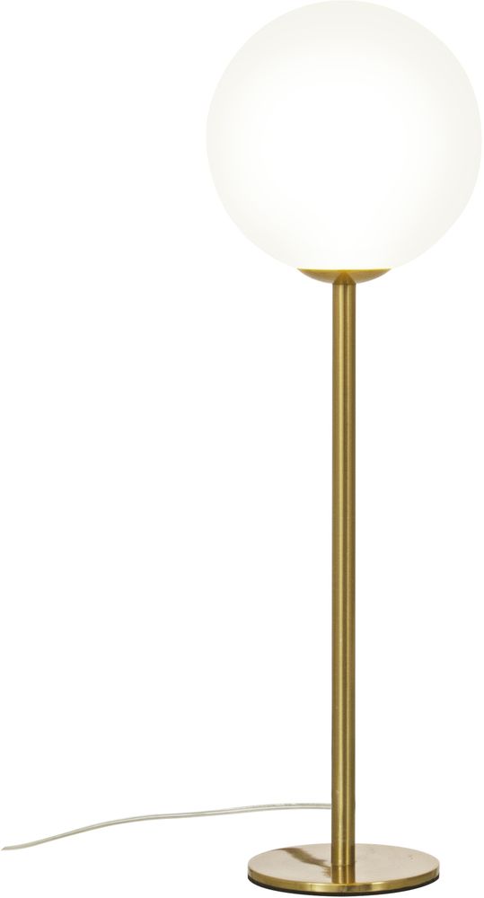 Pöytävalaisin metallia, matta messinkiviimeistely ja lasikupu opaalinvalkoisena.