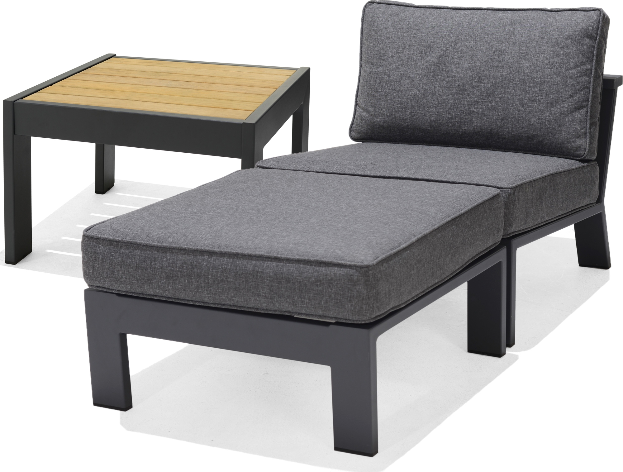Oleskeluryhmä, jossa 1 nojatuoli ilman käsinojaa, 1 rahi ja 1 sivupöytä. Valmistettu ruostumattomasta alumiinista ja FSC(TM)-merkitystä teakista. Olefiinityynyt.